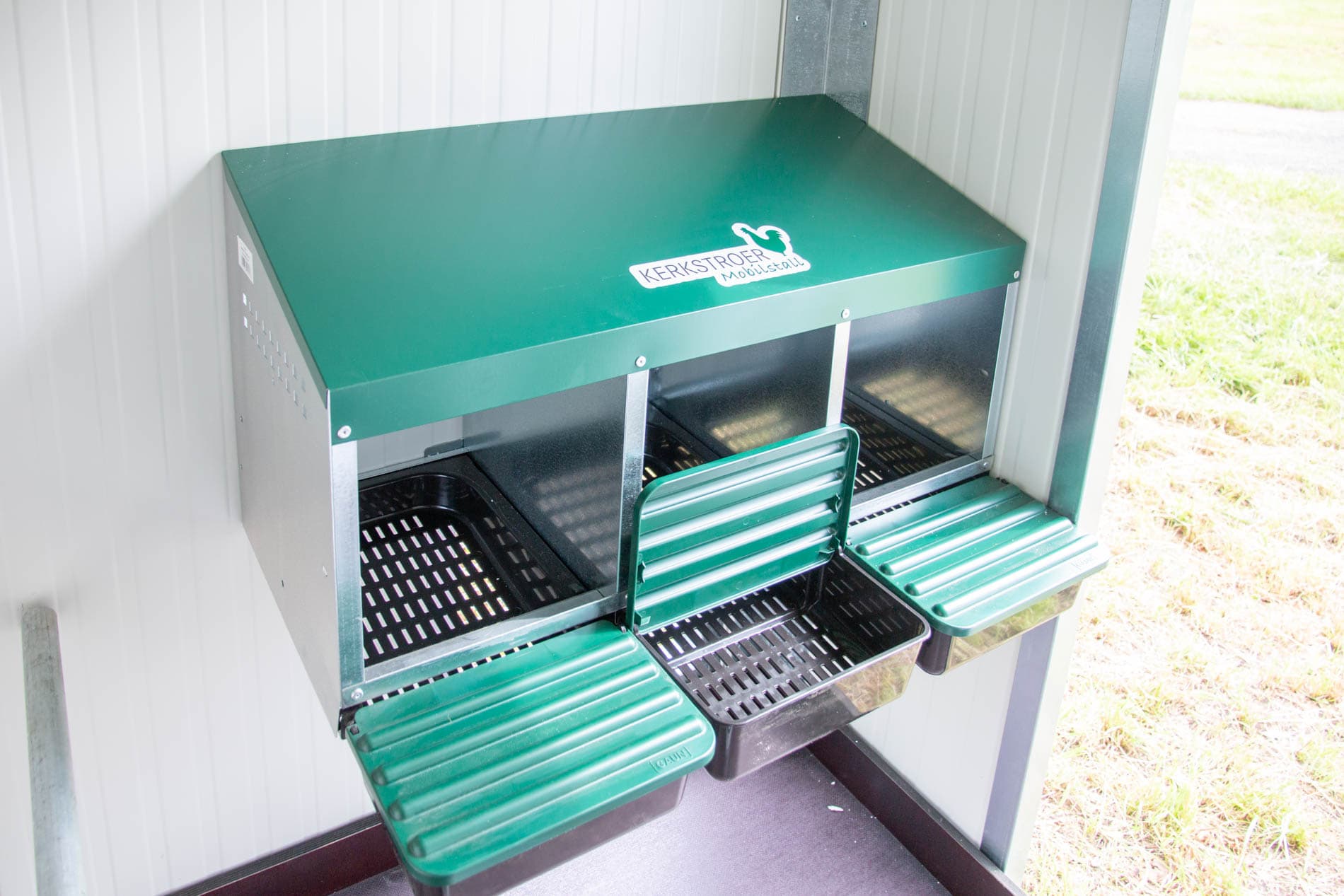 Hühner Platz und er verfügt über drei Legenester, einen Futterbehälter, einen Wasserbehälter und zwei