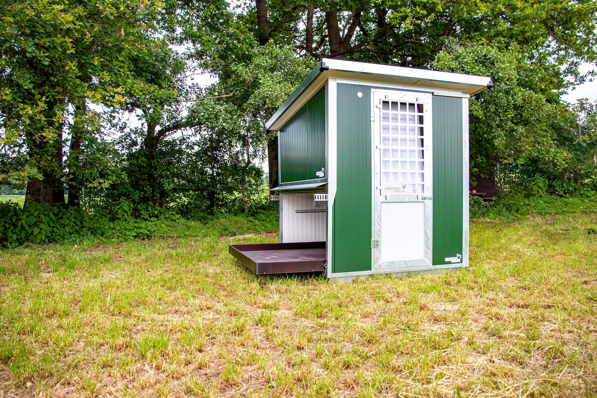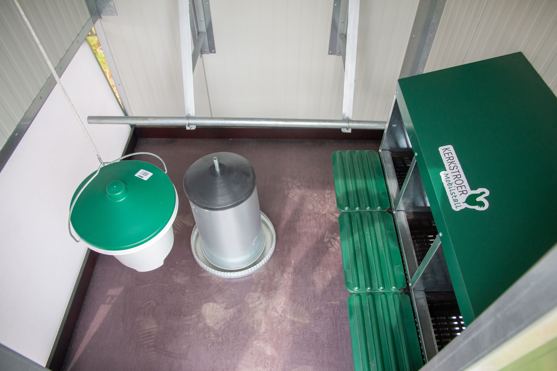 Im Inneren des Stalls sind nur leicht zu reinigende und hygienische Materialien verbaut. Das Innere besteht hauptsächlich aus Metall und Kunststoff. Schädlinge, wie zum Beispiel die Milbe, haben somit keine Chance sich in dem Stall dauerhaft anzusiedeln. Der Boden besteht aus einer wasserfesten Siebdruckplatte.